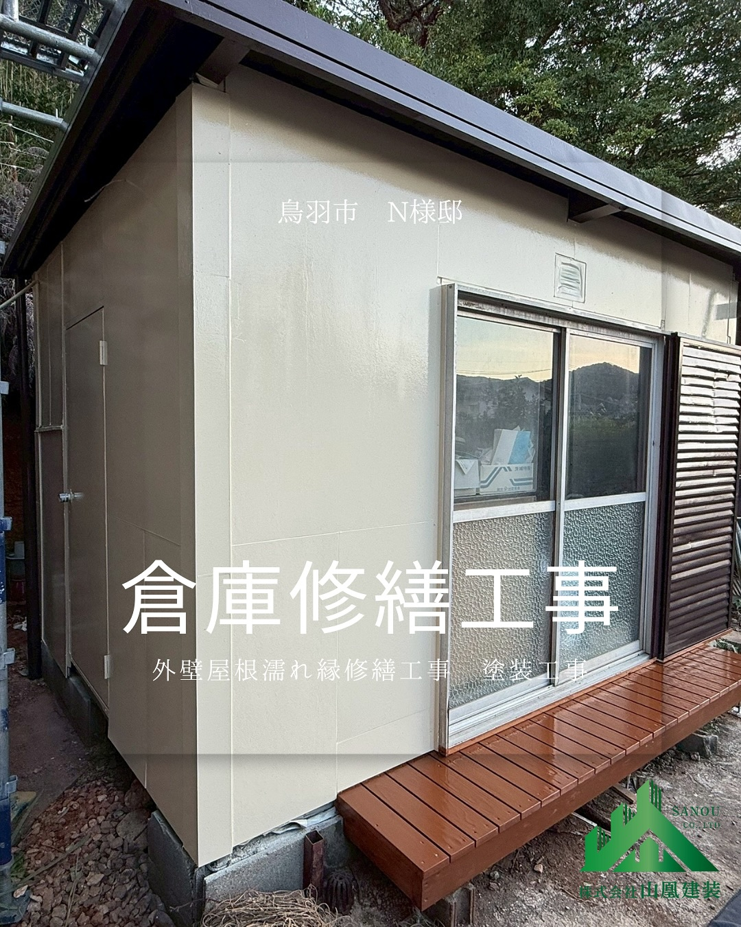 【倉庫修繕工事完了✨】今回は、鳥羽市N様邸の倉庫修繕工事をご紹介します😊長年の風雨や日差しの影響で外壁が傷み、塗装も剥がれてしまっていた倉庫。外壁には穴も空き、内部まで傷んでいる状態でした💦腐…